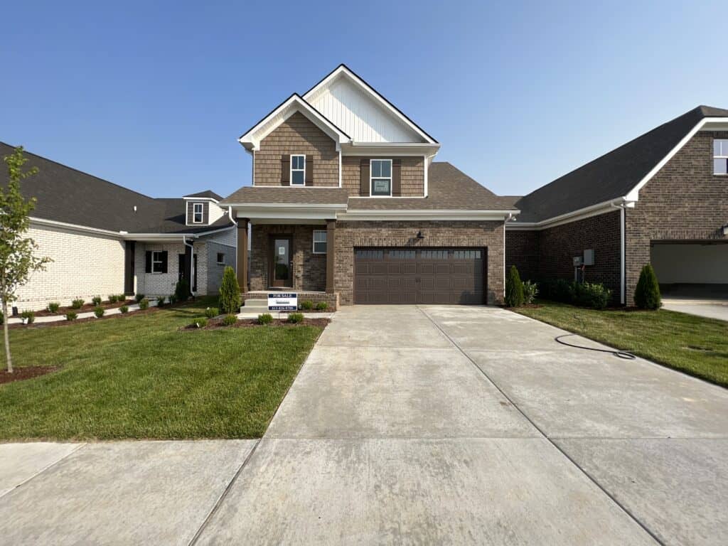 Calloway Plan with covered front porch -just short steps inside from the garage. Same plan as the model home. First floor primary bedroom is oversized with a large walk in closet and raised height double vanity bath with separate water closet. Recessed 9′ ceiling with fan included. A separate powder room bath for guests is off the foyer, which is nicely sized for your personal decorative touches. The kitchen island has a 1′ overhang perfect for extra seating. Enjoy the gas fireplace in the great room with tile surround and mantle. Upstairs there is a sprawling recreation room (large enough for pool/ping pong & perfect for cushy chairs and gaming) plus 2 additional bedrooms each with their own walk in closet with a full bath to share.